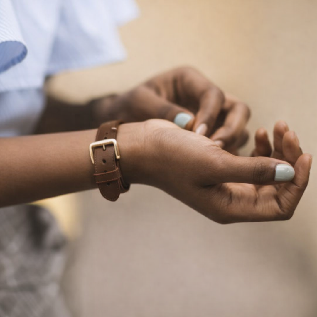 A faux leather NFC bracelet with an adjustable buckle closure. Instantly share your custom link - timeless style with smart functionality.